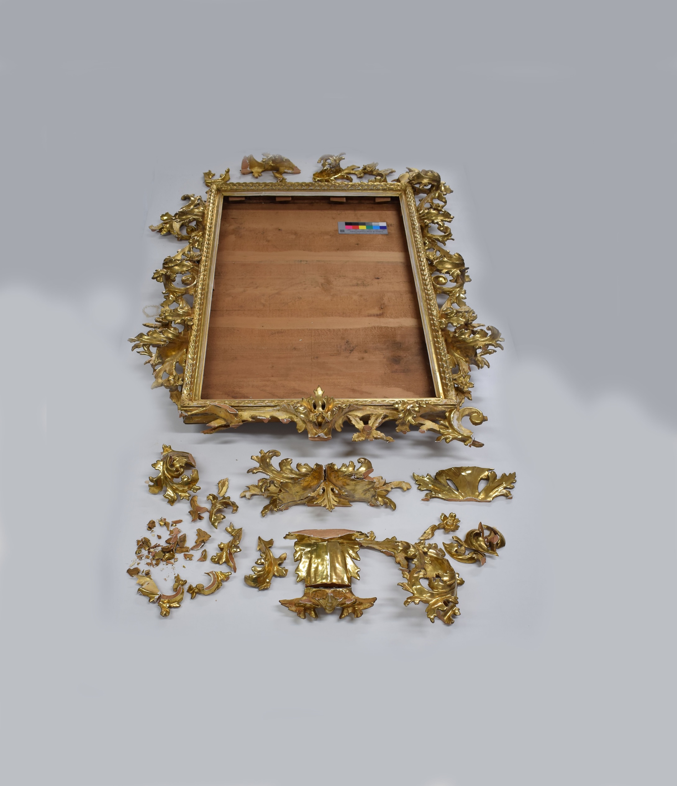 Ein großformatiger Rokoko-Spiegelrahmen (18. Jh.) kam nach einem Sturz in mehreren Bruchstücken zu uns. Der Rahmen ist in Linde geschnitzt – ein für fein plastische Rokoko-Ornamente typisches Weichholz – und klassisch polimentvergoldet. Typische Rokoko-Merkmale wie asymmetrische Rocaillen und geschwungene C-/S-Linien prägen solche Spiegelrahmen; sie wurden im 18. Jh. europaweit zu luxuriösen Raumausstattungen gefertigt.
